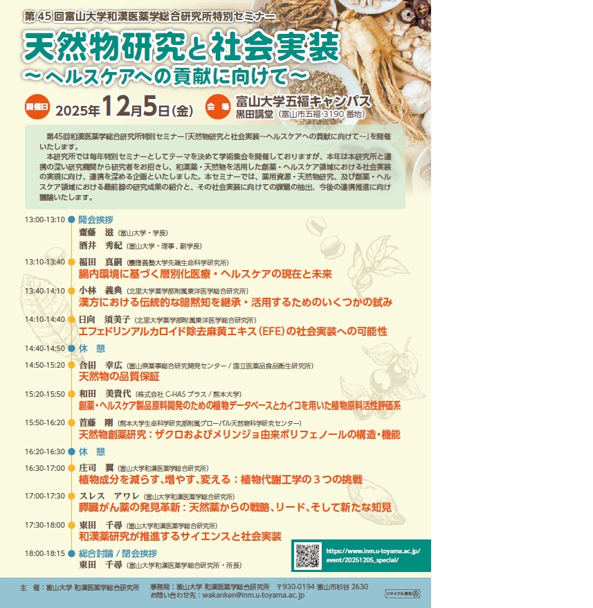 本研究所では毎年特別セミナーとしてテーマを決めて学術集会を開催しておりますが、本年は本研究所と連携の深い研究機関から研究者をお招きし、和漢薬・天然物を活用した創薬・ヘルスケア領域における社会実装の実現に向け、連携を深める企画といたしました。本セミナーでは、薬用資源・天然物研究、及び創薬・ヘルスケア領域における最前線の研究成果の紹介と、その社会実装に向けての課題の抽出、今後の連携推進に向け議論いたします。