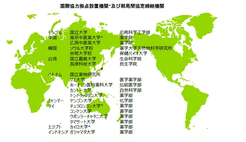 目覚ましい発展を遂げた現代西洋医学においても治療に難渋する疾患が多く、天然物を活用した伝統医学に関する研究成果や臨床効果に期待が寄せられています。伝統医学に関わる研究を高い水準で維持・発展させるためには、最新の研究方法論や天然物に関する情報交換が必要です。和漢医薬学総合研究所は天然物の研究を発展させるために、3カ国・3機関との間に国際協力拠点(ICC)を形成するとともに、9カ国・18機関と部局間協定を締結しています。