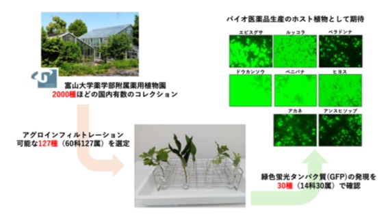 ・富山大学薬学部附属薬用植物園のコレクションを活用し、127種(60科127属)の植物をスクリーニングした結果、そのうち30種(14科30属)で緑色蛍光タンパク質(GFP) ※1)の発現に成功した。