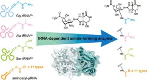 微生物は多様なペプチド性天然物を生産しており、これらは医薬品シーズとして重要な役割を果たしています。一般に、ペプチド骨格はリボソーム、非リボソーム型ペプチド合成酵素(NRPS)、あるいはATP-grasp酵素によって構築されます。特にNRPSやATP-grasp系では非天然型アミノ酸も取り込まれるため、化学構造の多様性が大きく拡張されます。一方で、リボソーム依存型の生合成では、tRNAに結合したタンパク質性アミノ酸のみが利用されるため、構造多様性は限定的であると考えられてきました。しかし近年、アミノアシルtRNAはタンパク質合成以外にも、細胞壁生合成や天然物生合成など、さまざまな生化学反応に関与することが明らかになりつつあります。