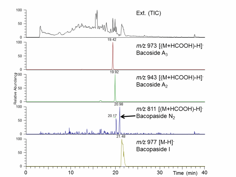 Figs. 2 and 3 show effect of chromatographic conditions on separation of bacopasides. When CH3COONH4 was used as solvent A (Fig. 2), the order of elution was: Bacopaside I → Bacoside A3 → Bacoside A2 → Bacopaside N1 → Bacopaside N2. In contrast, when HCOOH was used as solvent A (Fig. 3), the order of elution was: Bacoside A3 → Bacoside A2 → Bacopaside N1 → Bacopaside N2 → Bacopaside I. Figs. 4 and 5 show Quantitation of bacopasides. Fig. 4: Standard compounds. Fig. 5: Extract (10 mg/ml solution, 1 μl injection).